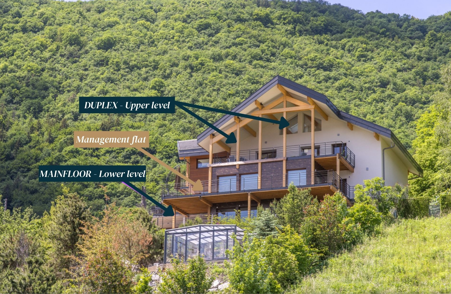 The Mainfloor (6-8 guests): family living, indoor-outdoor! A 170 m² family-friendly apartment with 3 bedrooms (including one for 4 guests), peripheral terrace, and direct access to the children’s play area, offering a true indoor-outdoor living experience.